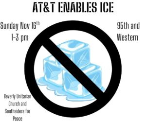 ICE has a multimillion dollar contract with AT&T to provide the communication services they are using to kidnap our neighbors and terrorize our communities. People of conscience across the city and state are standing up to demand that AT&T leadership stop their collaboration with the forces that our invading our city. We will be picketing outside the store and providing information about how our neighbors can take action to support this work. This is a joint effort of the Sunrise Movement, Unitarian Universalist Action Network of IL, Southsiders for Peace, and Beverly Unitarian Church. AT&T Store |