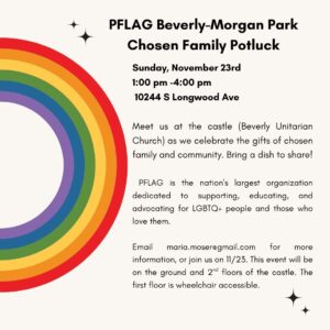 Join us for a PFLAG Chosen Family Potluck! BOTH Sanctuary and Dining Hall |